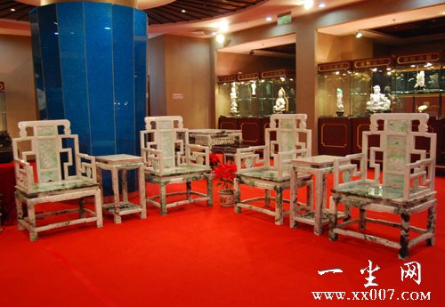 俗话说,室无玉不雅,厅无玉不华,居无玉不安,人无玉不贵。由广州市得盛玉器有限公司提供展出的这批翡翠家具,不仅可以观赏,还可以使用,并且极具收藏价值。此次在京展出6套,除了一组4条屏风是用紫檀和翡翠制作外,其余的桌、椅、凳、茶几等家具全部用翡翠A货制成。据该公司负责人吴财秀介绍,展品中最贵的是一组4把仿清太师椅,分别刻有春夏秋冬图案,价值1200万元;最便宜的是一对仿清圈椅,价值500万元。