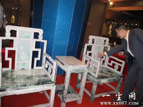 几十万元的翡翠镯子不为稀罕,几百万元的翡翠摆件也都见过,而用大块翡翠整料雕琢并且制成成套的翡翠家具,就是闻所未闻了。翡翠太师椅、翡翠长桌、翡翠方凳、翡翠茶几、翡翠屏风……当这些尽显奢华、身价不菲的翡翠家具在五一期间亮相北京官园珠宝城的时候,不仅让络绎不绝的观众惊叹,就连一些玉石专家都称奇,能把翡翠制成日用家具,真是罕见。