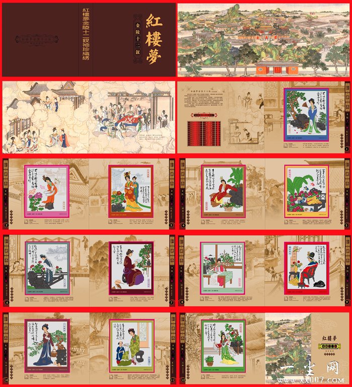 《红楼梦-金陵十二钗》袖珍织绣布局得当、意境清新,人物神态贴切逼真、服饰华贵艳丽,画面上身世地位大相径庭、性格志趣迥然相异的十二钗,栩栩如生,呼之欲出。亭台水榭、假山花草着色简淡又备见精巧,处处让收藏者感受到袖珍织绣艺术的风采和魅力。其判词书法劲峭飘逸,笔势洒脱,风华自足。