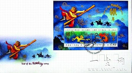 从国外邮政发行的邮票来看,“西游记”的影响也是非常大的。2004年,加拿大发行的猴年生肖邮票,设计图构思都取自中国古典小说《西游记》中的西天取经,图案分别为孙悟空大战玉皇大帝以及悟空向师傅悔过,上有中文“猴年”和英文Yearof the Monkey字样。无独有偶,2004年澳大利亚发行的猴年邮票也取材于《西游记》。