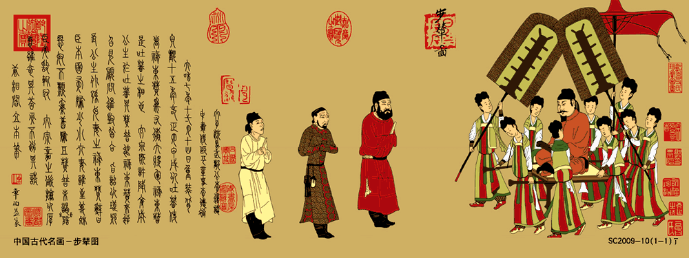 秦以后将帝王、皇后所乘之辇(车)去轮为舆,改由人抬,称步辇。《步辇图》为绢本设色,纵38.5厘米,横129.6厘米,由北京故宫博物院收藏。7世纪,我国西南的吐蕃(今西藏地区)开始强大兴盛,其三十二世赞普松赞干布仰慕大唐文明,向唐王朝要求和好联姻。唐太宗李世民答应将宗室女文成公主许配给他。贞观十五年(641年),松赞干布派相国禄东赞到长安迎娶文成公主入藏。《步辇图》画的就是唐太宗接见吐蕃使者禄东赞的场景。唐蕃联姻,掀开汉藏两族友好关系的良好的开端。