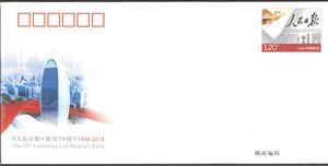 中国邮政定于2018年6月15日发行《<人民日报>创刊70周年》纪念邮资信封1套1枚。详情如下: