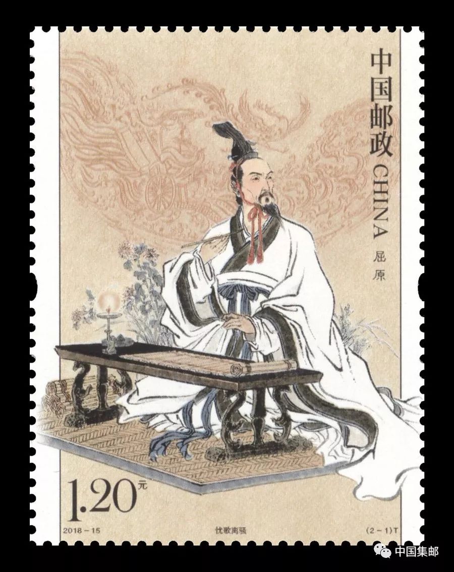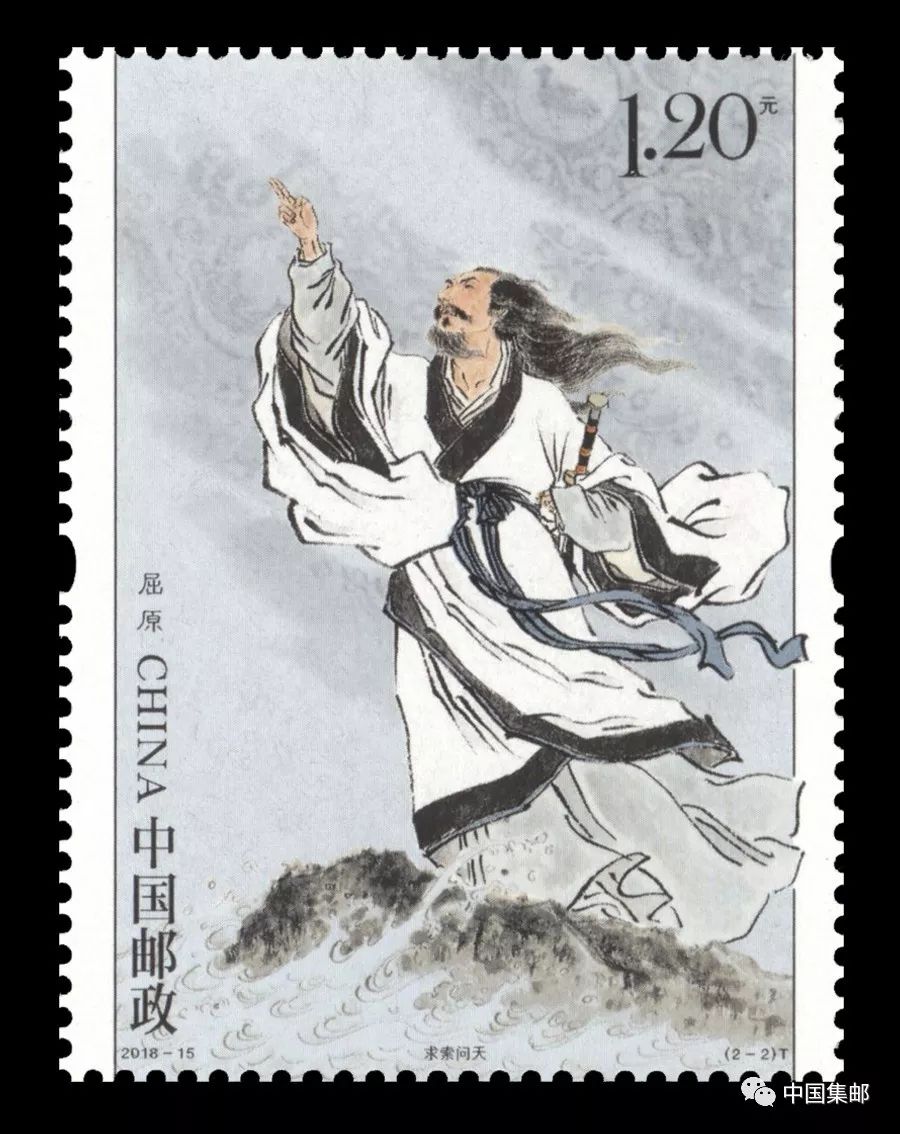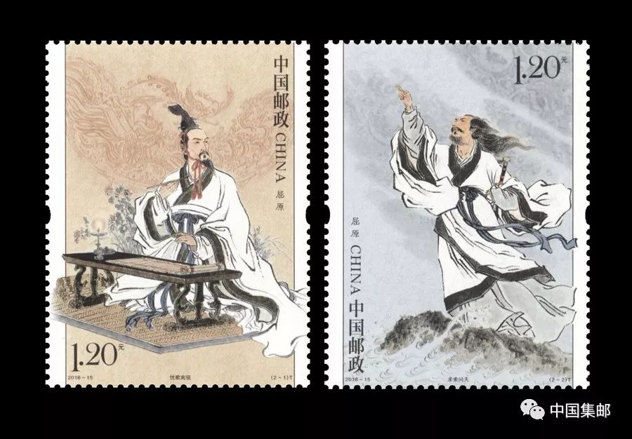 中国邮政定于2018年6月18日发行《屈原》特种邮票1套2枚、小型张1枚,邮票图案名称分别为:忧歌离骚、求索问天,小型张图案名称为:屈原像,全套邮票面值8.40元。