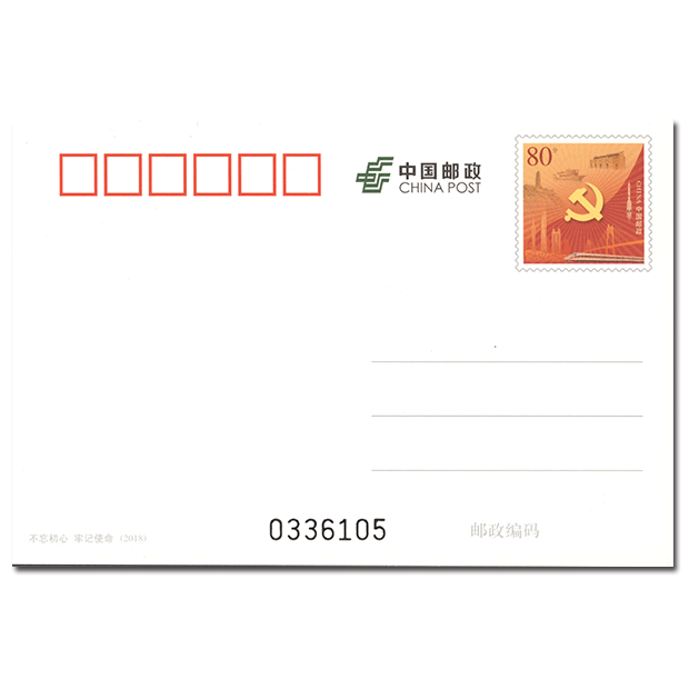 中国邮政定于2018年7月1日发行《不忘初心 牢记使命》普通邮资明信片2枚。详情如下: