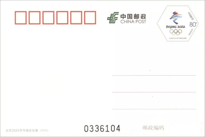 中国邮政定于2018年8月8日发行《北京2022年冬奥会会徽》普通邮资明信片1套1枚。详情如下: