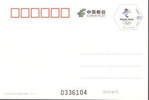 中国邮政定于2018年8月8日发行《北京2022年冬奥会会徽》普通邮资明信片1套1枚。详情如下: