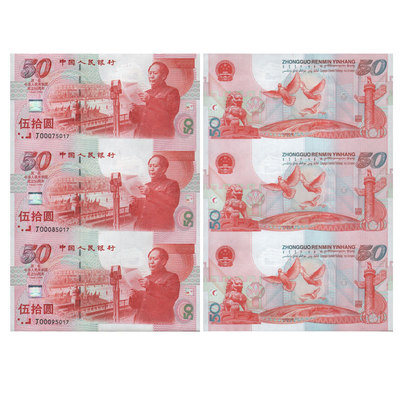 建国50周年纪念钞三连体是新中国第一张纪念钞是在1999年9月20日为了庆祝我国建国50周年发行的,它更是第一张纪念连体钞,发行量5万张是目前发行量最小的纪念连体钞,在那时刚发行时就受到人们的喜爱和收藏。建国50周年纪念钞三连体它记录了新中国走过50个春秋,才并且在我们5000多年的文明史上留下重重的一笔关于我们新中国50周年的记载。它不愧为国家大记事题材藏品收藏意义很好总面值达到150元。