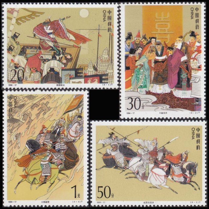 《三国演义》是中国古典四大名着之一,全名为《三国志通俗演义》,为元末明初小说家罗贯中所着,是中国第一部长篇章回体历史演义小说,描写了从东汉末年到西晋初年之间近100年的历史风云。《三国演义》是最后“搬上”邮票的四大名着,其第一组邮票于1988年发行,之后分别于1990年、1992年、1994年和1998年发行第二至五组,历时10年,共计发行邮票20枚和小型张3枚。图为第三组《三国演义》系列邮票,全套4枚,内容分别为“舌战群儒”、“智激孙权”、“蒋干盗书”和“草船借箭”。