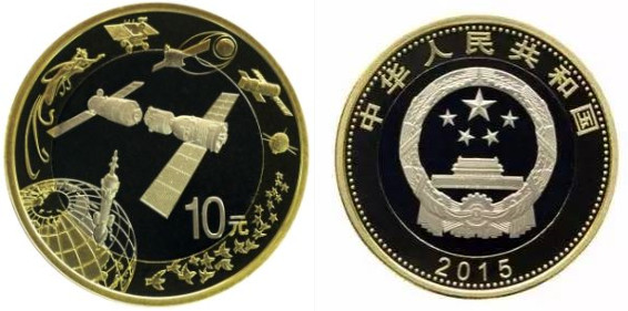 航天纪念币正面的图案中间依然还是以国徽为主元素,在它的上方是“中华人民共和国”字样,下方当然还是年号“2015”;纪念币的背面图案主图是神舟九号飞船在对接航天器的画面,在这画面的外围部分则是由东方红一号卫星、神舟五号飞船、嫦娥一号飞船、月球车等组成的图案,布局十分合理,同时又将我国这些年在航天领域取得的伟大成就都展现在了这小小的币面上。