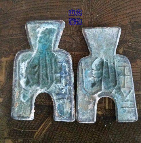 左稍大者,钱体较薄,高:60mm;脚宽:38mm;重:17.4克。