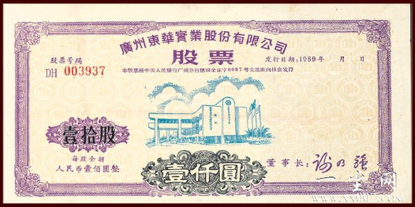 “广州东华实业股份有限公司股票”全套共有四枚:壹股(壹佰元)、伍股(伍佰元)、壹拾股(壹仟元)、伍拾股(伍仟元)。票面设计独具匠心:将东华汉语拼音缩写D.H字母巧妙地组合、构成居家小屋图案。俯视票面(采用了折光潜影技术)整个底版上布满了无数个居家小屋置于一个个地球状的空间中,寓意东华品牌,立足房产,誉满全球。此套股票防伪独特,壹股、伍股和壹拾股采用凹凸版印刷(手感明显),暗记特别,在右侧发行日期的下方有一个比一元人民币硬币略大的企业司标,其从股票水平方向看,清晰可见,极难仿造。其伍拾股防伪更为特别,既有上述凹凸版印刷、暗记防伪,又加盖了公司钢印和骑缝章、董事长印鉴,且票面尺寸比其他票面略宽。该股票在上市公司股票中的防伪独一无二,极具收藏与投资价值。