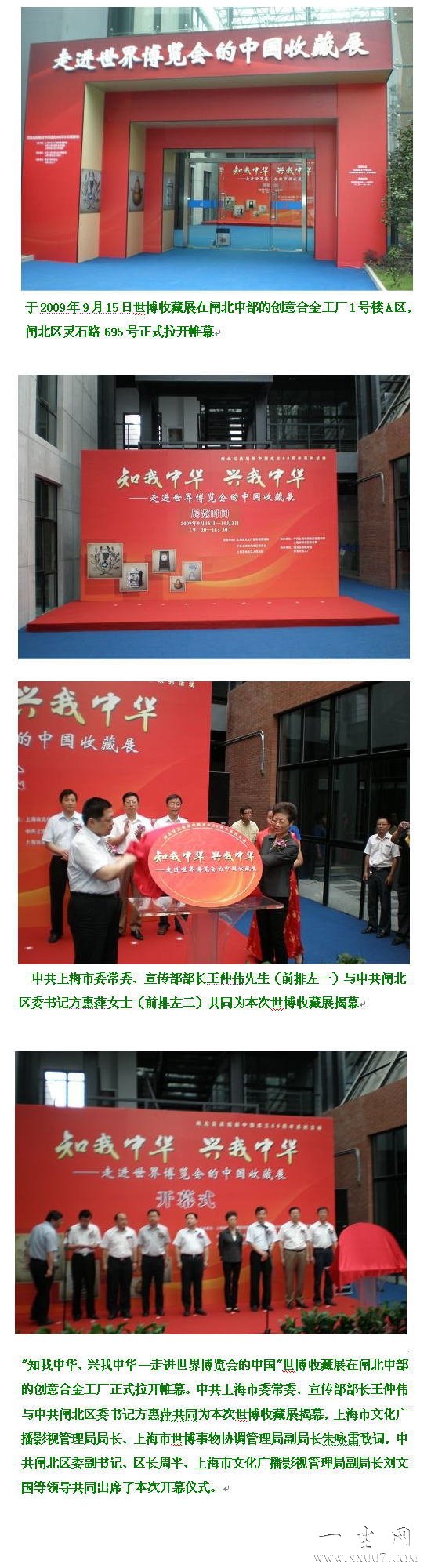 由上海市文化广播影视管理局。中共上海市闸北区委员会、上海市闸北区人民政府主办的“知我中华兴我中华”的《走进世博会的中国收藏展》于