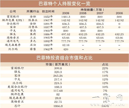 根据美国证交会日前披露的文件,截至2009年12月31日巴菲特个人投资组合中共包括十家公司的股票,分别是富国银行、美国合众银行、强生、卡夫食品、宝洁、沃尔玛、设备制造商英格索兰,以及三家伯克希尔未投资的公司——埃克森美孚、通用电气和美国联合包裹运输公司(UPS)。目前这一部分投资组合的市值已达到18.6亿美元,年股息收入为425.8万美元。该文件没有披露巴菲特在美国以外地区以及在固定收益证券领域的投资。
