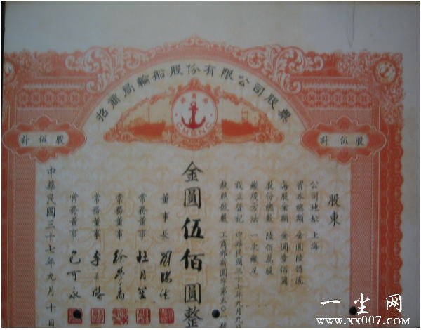 如图 “招商局轮船股份有限公司股票”发行于1948年9月10日,票面额为5股,总金额为金圆500元。董事栏里的一串名字,在“上海滩”上都是赫赫有名的:除了董事长刘鸿生(火柴大王)、常务董事杜月笙大家比较熟悉外,总经理徐学禹是宋子文的心腹,曾任上海电话局局长、浙江省公路局局长、福建省银行董事长等职;常务董事李景潞曾任北洋政府交通部鲁政司司长、国民政府经济部次长等职;常务董事包可永曾任上海电保局局长兼国际电信局局长,他还是被称为“鸳鸯蝴蝶派”开山鼻祖和“通俗文学之王”包天笑得大公子。 |