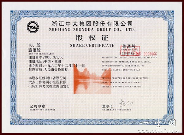 另外,通过电话从该公司了解到,浙江中大这枚实物股票虽然印制好了,但由于处在实行无纸化改革时期,没能来得及发行,也就成为了”未发行股票”,现在该公司留下存挡的股票也只剩了几枚,具体有兴趣的藏友可去该公司查询.
