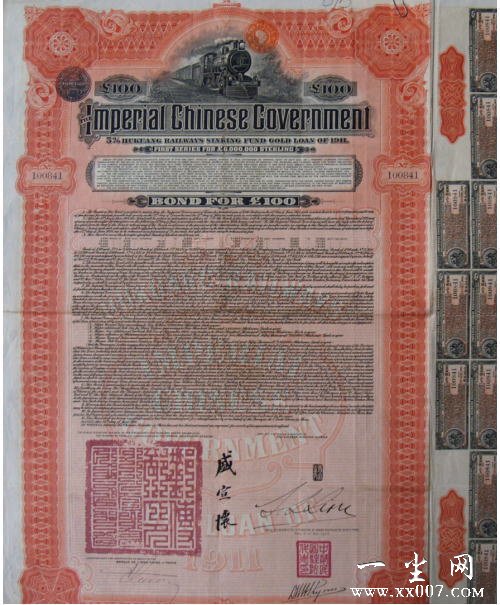 湖广铁路100英镑债券是清政府于1911年(宣统3年)在欧洲发行的债券,首次发行600万英镑,由清政府邮船部大臣盛宣怀签署,每券售价不明,到期后可以5%利息分80次偿还,近百年的文物老债券,深具史料价值。