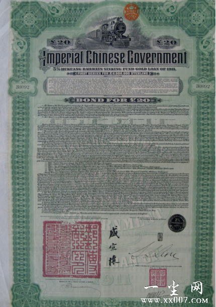 湖广铁路20英镑债券是清政府于1911年(宣统3年)在欧洲发行的债券,首次发行600万英镑,由清政府邮船部大臣盛宣怀签署,每券售价不明,到期后可以5%利息分80次偿还,近百年的文物老债券,深具史料价值。