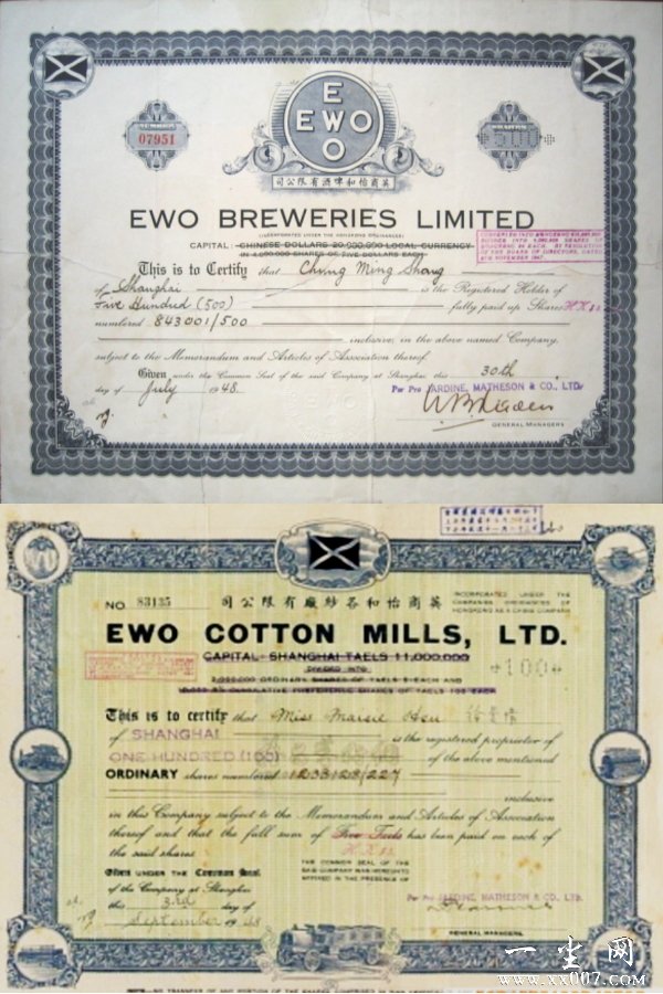 上图这张“英商怡和各纱厂有限公司股票”发行于1949年。这张股票的设计很有特色:票面四边上的七个图案,很形象地向人们显示了英商怡和各纱厂从棉花到成品出厂的全过程。