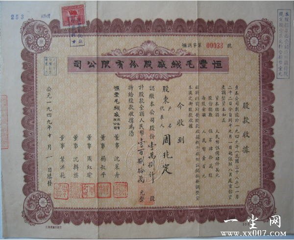 1949年10月1日,在开国大典的隆隆炮声中,“恒源祥”发行了新中国的第一张股票,它的总股本为5.4亿元,这正是当时中国人口数量的总和,具有着特殊的象征意义。1949年9月27日,全国政协一届一次会议刚刚通过《关于中华人民共和国国都、纪年、国歌、国旗的决议》,而这张1949年10月1日发行的“恒丰毛绒厂股份有限公司股票”(上图),就已经贴上了五星红旗的印花税票,真可谓珠联璧合。