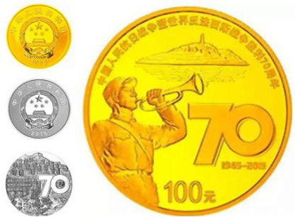 据了解,抗战胜利70周年纪念币主要包括1枚镍包钢纪念币,2枚银纪念币,1枚金纪念币。其中,镍包钢纪念币为普通纪念币,面值1元,发行数量为5亿。1/4盎司金币的发行数量为5万,1盎司银币和5盎司银币的发行数量分别为10万和5000枚。与其它题材的纪念币相比,抗战胜利70周年纪念币的发行数量并不是很多,尤其是金银纪念币。因此,但从发行的数量来看,其也具备一定的收藏价值。