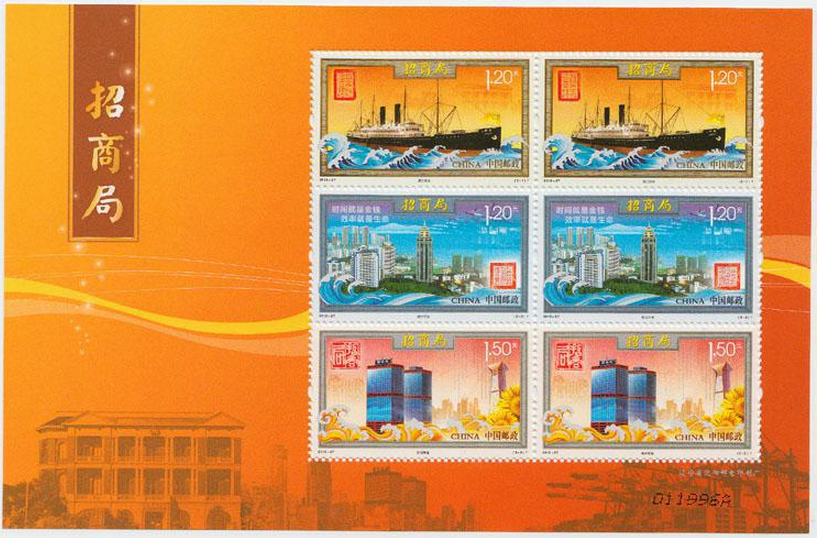 为庆祝招商局成立140周年,中国邮政于10月26日发行了招商局邮票一套3枚,三枚图案分别是浦江创业、蛇口开发、再创辉煌,面值3.9元,同时发行了小版张(一版两套),面值7.8元。这是招商局成立140周年,国家邮政第一次发行邮票。