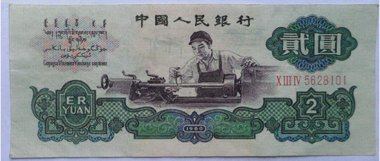 1960年2元人民币因为正面主景图为车床工人而被称为“车床工人”,60年2元钞分为两个版本,分别为实心五角星水印和空心五角星和古币混合水印,非常稀有,存世量少,因此价格比实心五角星水印的“车床工人”高些。市场上有一种说法为“车工现象”,就是在讲这张1960年2元人民币,在90年代初停止发行,但在90年代中期还有较大的流通量,现今的存世量并不是很小,但在短短的20年间就有近千倍的涨幅着实让人惊叹,因为罕见,所以第三套人民币1960年2元的升值现象成为纸币收藏投资中标志性的现象。