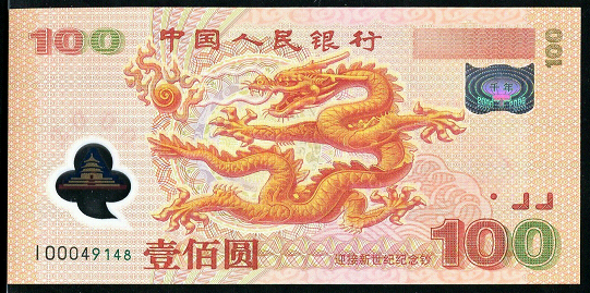2000年11月28日,中国人民银行发行了我国首枚塑钞——“迎接新世纪”纪念钞。正面以北京北海公园九龙壁上“大升龙”为设计依据,雄姿矫健,威严无比,从大海中腾空而起,张开百川大口,直视左侧熊熊燃烧的“火球”,如同为迎接新千年到来而跳起了吉祥舞蹈。背面主景图案为迎接新世纪的代表性建筑——“中华世纪坛”。从外观设计上来讲,体现了中华五千年文明的精髓,从内在来讲,“龙”是中华民族的象征,中国人民是龙的传人,在千禧年到来之际,发行以龙为主题的纪念钞,展现了我国政治稳定、民族团结和社会进步的现实,对增强我国各民族人民的凝聚力和向心力有着重要意义。