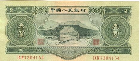 第二套人民币井冈山绿叁元是我国首枚三元人民币,也是唯一的一张以三为面值的人民币。它的颜色十分特殊,纸币整体的底色是淡淡的绿色,颜色呈深色。在币面上,正面的两侧都写着三元,用的是繁体字体。上方写着发行方中国人民银行,下方标有年号1953年,中间的图案是龙源口石桥图案,中间的花纹是黄色的,旁边的花颜色呈深绿色。而纸币的背面是国徽和花纹。同时这张纸币还有别名苏三币。