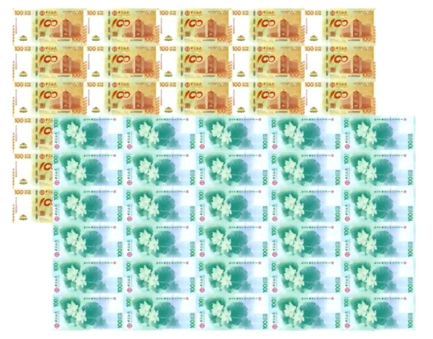 【藏品名称】中国银行成立100周年纪念钞整版30连张(澳门荷花整版钞)