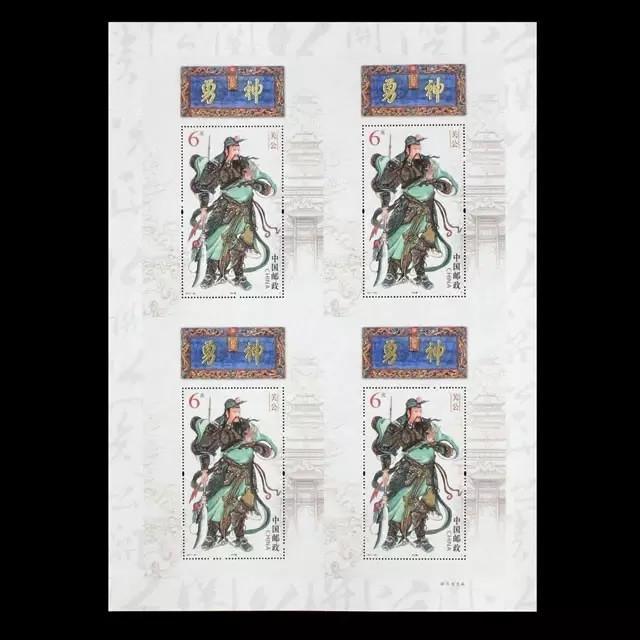 2011年9月12日发行的《关公》特种邮票中,也特别制作了四连体小型张。值得一提的是,该四连体小型张的印刷材质为丝绢,并非单体小型张印刷所用的邮票纸材质。时逢邮市热潮,关公四连体面市亮相以来,很快便在邮票市场掀起了一股涨价龙卷风。