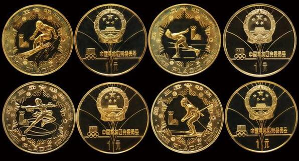 1980年发行 纪念1980年冬奥会的纪念币 此币没有中华人民共和国的年号,只有中国奥林比克运动会的字样,4枚铜币,精制币, 古代角力 古代马术 古代射艺 男子速滑