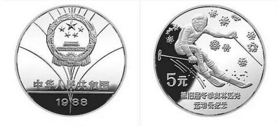 ▲1988年发行的第16届冬奥会(滑降)银币
