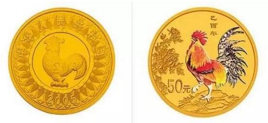 ▲2005年发行的乙酉(鸡)年1/10盎司彩金币