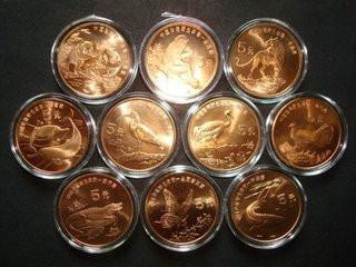 中国珍稀野生动物系列普通纪念币:也是一套设计省事的纪念币,同样的正面图案直接用当时流通硬币的(第三套硬币),也是目前直径最大的普通纪念币(32mm)和唯一的紫铜合金纪念币。