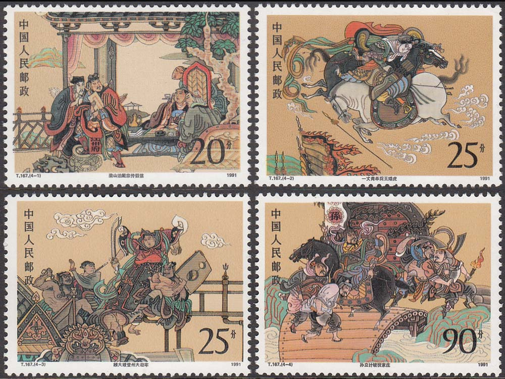 1987午22月20日,为了反映中国古典文学的宝贵遗产,中华人民共和国邮电部在发行T.123《中国古典文学名着——<水浒传>(第一组)》特种邮票的同时,还发行了这枚小型张。周峰设计。面值2元。尺寸规格140毫米×87毫米,邮票票幅规格90毫米×60毫米。发行量413.17万枚。影写版。齿孔11.5度。背面刷胶。北京邮票厂印制。