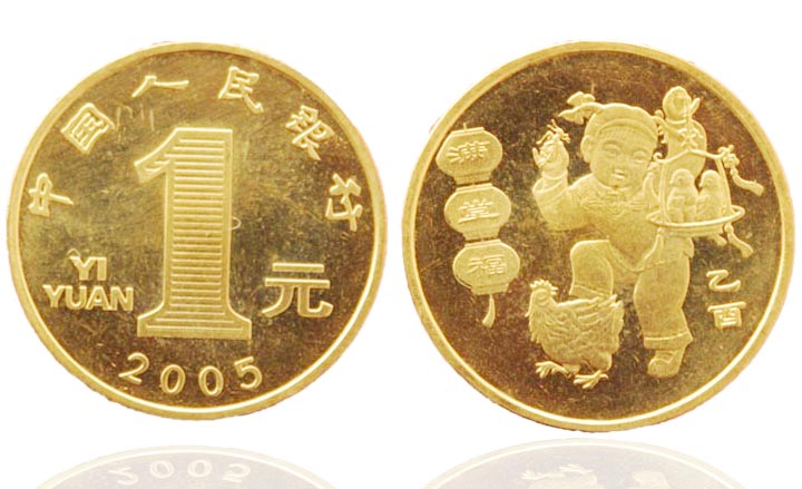 中国人民银行决定自2004年10月23日起陆续发行2005中国乙酉(鸡)年金银纪念币一套。该套纪念币共12枚,其中金币6枚,银币6枚,均为中华人民共和国法定货币。中国十二生肖纪年习俗中,将地支“酉”与鸡相配,已有2000余年历史。1975年,中国湖北省云梦睡虎地第11号秦墓出土竹简已见“酉,水也”之记述,在古汉语中“水”有读为“雉”,亦即现今为“鸡”。