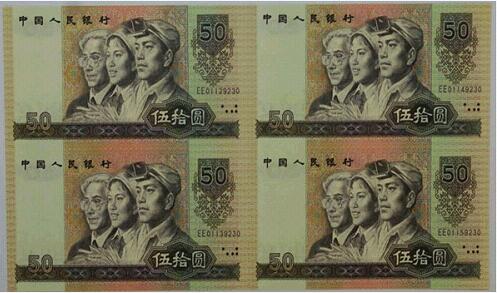80版50元四方连体钞由四张未裁切的第四套人民币1980年版50元构成。由于第四套单张50元钞价格较高,收藏难度较大,因此很多人将50元四方联连体钞裁切成四张单钞出售,以供收藏或者配册者选用。如此,造成了该连体钞数量锐减,价格飙升。