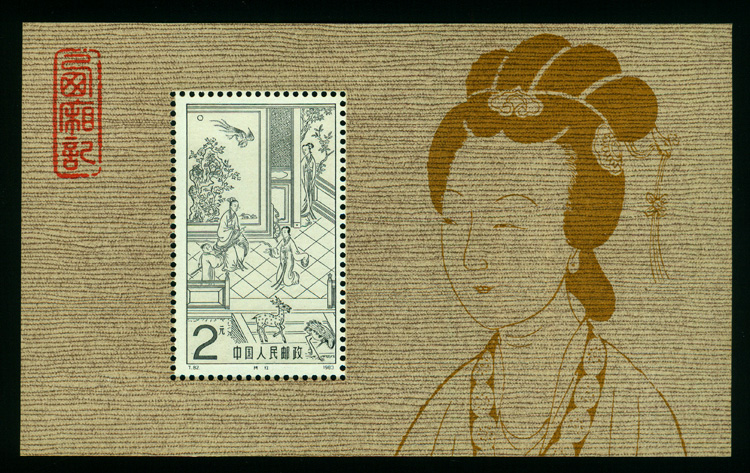 4.量规格:T.82M真品邮票票幅规格31毫米×52毫米,在T.82M伪品中,“甲种”伪品票幅规格31毫米×53毫米,故伪品底边挨近齿孔的小型张边饰与真品相比有着明显的不同。边饰图右半部的仕女图和左上角的“西厢记”图章均为重新描绘,足可以假乱真,但在细微部分,仍存有较明显区别,需要认真鉴定。