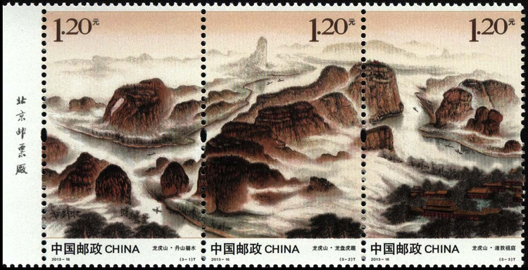 邮票设计采用的传统的笔墨语言去表达龙虎山,按此思路创作出来的作品也容易与龙虎山的传统文化相融,更具有人文气息。3枚邮票采取竖式构图,纵向立意。在构图上注意气势,做到气息连绵、云气环绕。小型张“仙班迎宾”采取横式构图,以求“广”、“博”之势,图案以中远景构图,近景林木繁茂,芦溪河蜿蜒流淌,为龙虎山增添了几分江南诗意。中景处云雾缭绕,丛林若隐若现,气息婉转自然。远景描绘的“仙班迎宾”景象更显其神秘之感。 《龙虎山》特种邮票原计划2008年发行,当时计划发行的枚数为2枚,后因奥运会和汶川地震原因而推迟,这一推迟就是五年。推迟在2013年发行时,中国邮政增加发行邮票小型张各一枚。该套邮票是今年继《中国古镇(一)》特种邮票后第二套旅游景点票。这枚邮票小型张是值得推荐的。