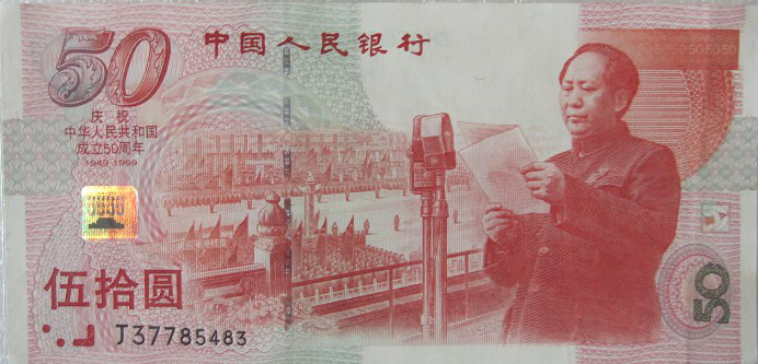 这是为庆祝中华人民共和国成立50周年而发行的面值50元的纪念钞,发行量为6000万张。