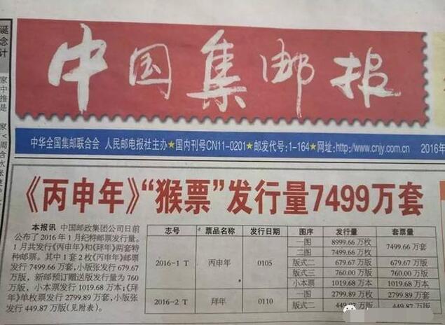 丙申年猴票和拜年(二)的发行量,出乎许多人的意料,总体与2015年发行量相当,甚至还有所下降,这也是猴票价值稳中有升的重要影响因素。
