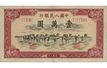 而第一套人民币中的10000元“骆驼队”排名“绝品四珍”之尾,发行于1951年10月1日,停用于1955年4月1日,面值10000元,尺寸140mm×75 mm,由上海印钞厂印制,印制工艺为胶印五色,三字冠、七号码,其正面图案为行走在沙漠上的骆驼,主色调为茶红。背面图案为花符,浅蓝与红色相间。壹万圆“骆驼队”。背面印有维吾尔文“中国人民银行”字样。发行范围为新疆维吾尔自治区。骆驼队”存世数量极少,难见全新者,全品基本有价无市,如果品相能达9品以上的已被行家认为是大珍。从近年拍卖市场情况看,市场上仅出现过一枚全新的“骆驼队”,目前市场售价为27万元以上。