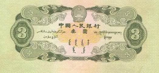 据了解,三元人民币是第二套人民币中的罕见币种,整体呈淡绿色,是我国唯一一张面额为三元的人民币纸币。纸币下方标着“1953年”,正上方为“中国人民银行”字样,中间是井冈山龙源口石桥图景,于1955年3月1日发行、1964年5月15日停止收兑和流通并回收,目前存世量极少。