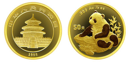 说起金银币,名气最大的就是熊猫金币。第一套熊猫金币由中国人民银行在1982年发行。第一套发行时没有设置面值,分为1盎司、1/2盎司、1/4盎司和1/10盎司四款规格。从1983年开始,熊猫金币增加了1/20盎司,总重量增至1.9盎司,折合53.9克,且每枚金币均标明面值。现在熊猫金币已经成为国际五大投资金币之一,每年发行一次。