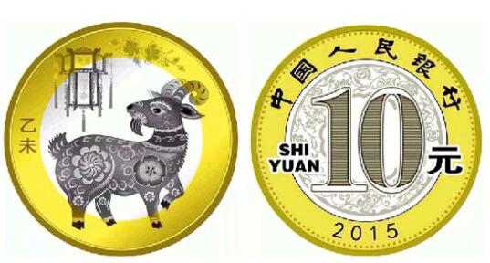 中国人民银行定于2014年10月10日发行2015中国乙未(羊)年金银纪念币一套。该套纪念币共16枚,其中金币9枚,银币7枚,均为中华人民共和国法定货币。该套金银纪念币正面图案均为中华人民共和国国徽衬以连年有余吉祥纹饰,并刊国名、年号。背面图案均为盘羊造型衬以装饰羊首纹样,并刊面额及“乙未”字样。