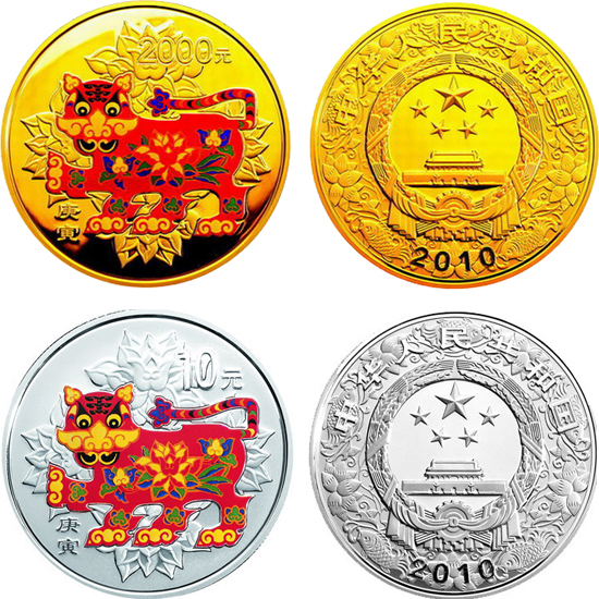 该银质纪念币背面图案为民间传统装饰虎造型衬以吉祥花卉图案(局部彩色),并刊面额。
