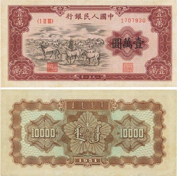 备注:第一套干部币1万元折合第二套大众币1元。于是,面值1万的牧马图相当于新版面值1元。