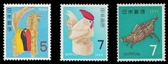 无独有偶,日本的生肖邮票,也大量使用传统的生肖玩具作为邮票画面。