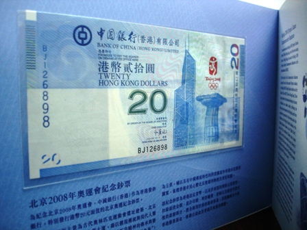 香港奥运纪念钞,顾名思义面值是20元,正面为古代奥林匹克运动会遗址建筑、北京2008奥运会会徽,香港中银大厦;纪念钞背面以北京奥运会主体育场国家体育场“鸟巢”,祥云图案,紫荆花图案。整体的图案设计以及色彩搭配都非常出众,而这样一张题材优秀的纪念钞发行量仅仅只有400万张而已,考虑到部分被用于四连体以及整版35张的装帧,单张的香港奥运纪念钞其实要比400万少不少。近十年左右的时间里,香港奥运纪念钞的行情可以说是稳步上升。