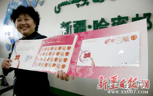 哈密:邮局工作人员在展示纪念“三八”邮品